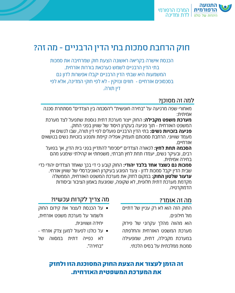 - הסמכת בתי דין רבניים לדון בנושאים אזרחיים באופן שיפגע בזכויות נשים ויצור חלופה למערכת המשפט.