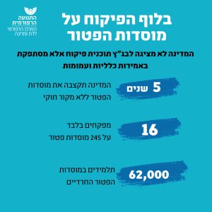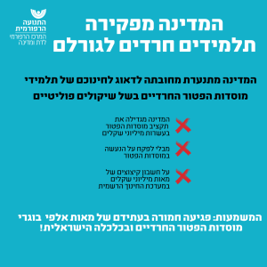 מדובר בכ־62,000 תלמידים ב־245 מוסדות כאשר חלקם כלל אינם עומדים בדרישות החוק, שמחייבים מינימום של 55% שעות לימוד ליבה. תקצוב מוסדות חינוך חרדיים שאינם מלמדים ליבה הוא אסון בעל השלכות כבדות על החברה והכלכלה בישראל. בזמן שמדינת ישראל במלחמה ומתמודדת עם הוצאות עצומות, מפזרת הממשלה מאות מיליוני שקלים לחינוך החרדי, שעה שהיא אינה מפקחת על השימוש בכספים אלו. הכספים אינם משמשים למטרתם שהיא הענקת חינוך בסיסי לילדים חרדים, והתוצאה היא – תלמידים חסרי כלים בסיסיים להשתלבות בחברה ובתעסוקה.