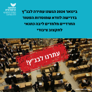 העתירה, שהוגשה על ידי עו"ד ריקי שפירא רוזנברג מהמחלקה המשפטית במרכז הרפורמי לדת ומדינה, מבקשת להורות לממשלה על ביטול התקצוב הנוסף למוסדות הפטור כפי שאושר על ידי הממשלה ובמקביל – להורות לממשלת ישראל ולשר החינוך לפעול על מנת לוודא שהתקצוב למוסדות הפטור של החינוך החרדי מועבר בכפוף ללימוד תכנית הליבה.